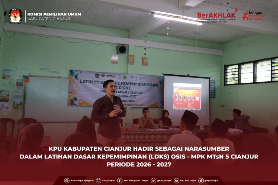 Cianjur - Komisi Pemilihan Umum (KPU) Kabupaten Cianjur diundang sebagai narasumber dalam kegiatan Latihan Dasar Kepemimpinan Siswa (LDKS) yang diselenggarakan oleh Madrasah Tsanawiyah Negeri (MTsN) 5 Cianjur, Kamis (22/1). Kegiatan ini menjadi sarana edukasi bagi para siswa untuk memahami kepemiluan dan nilai-nilai demokrasi sejak dini. Pihak MTsN 5 Cianjur menyambut baik kehadiran KPU Kabupaten Cianjur dan mengapresiasi kesempatan yang diberikan kepada siswa untuk memperoleh pemahaman langsung dari penyelenggara pemilu. Antusiasme peserta terlihat dari keaktifan dan perhatian penuh siswa selama kegiatan berlangsung. Dalam kegiatan tersebut, Kepala Divisi Sosialisasi, Pendidikan Pemilih, Partisipasi Masyarakat, dan Sumber Daya Manusia KPU Kabupaten Cianjur, Fikri Udah NSY, hadir sebagai narasumber. Ia menyampaikan materi terkait sistem pemilihan umum di Indonesia, perbandingannya dengan beberapa negara, serta pentingnya peran pemilih dalam menentukan arah kepemimpinan dan kebijakan bangsa. Fikri menekankan bahwa pemilu merupakan sarana kedaulatan rakyat yang hasilnya akan berdampak langsung pada berbagai aspek kehidupan berbangsa dan bernegara. Selain itu, ia juga mengajak para siswa untuk menyuarakan aspirasi secara santun, menghindari cara-cara yang tidak demokratis, serta membangun budaya partisipasi politik yang sehat. Lebih lanjut dijelaskan bahwa KPU merupakan lembaga negara yang bertugas menyelenggarakan pemilihan umum dan pemilihan kepala daerah secara langsung dan periodik setiap lima tahun sekali. Setiap warga negara yang telah memenuhi syarat administrasi dan tidak dicabut hak pilihnya memiliki hak yang sama untuk memilih dan dipilih. Melalui kegiatan ini, diharapkan para siswa MTsN 5 Cianjur memiliki bekal pengetahuan dan kesadaran sebagai calon pemilih pemula di masa mendatang. KPU Kabupaten Cianjur pun menegaskan komitmennya untuk terus membuka ruang kerja sama dengan satuan pendidikan dan masyarakat dalam rangka memperkuat pendidikan pemilih. #KPUMelayani ....