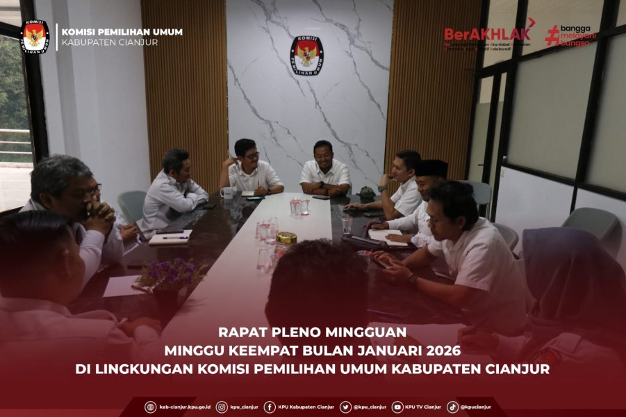 Cianjur - Komisi Pemilihan Umum (KPU) Kabupaten Cianjur kembali melaksanakan Rapat Pleno Mingguan pada minggu keempat bulan Januari 2026. Kegiatan ini berlangsung di ruang rapat KPU Kabupaten Cianjur pada Senin (26/1). Rapat dipimpin oleh Ketua KPU Kabupaten Cianjur, Muchamad Ridwan, dan dihadiri oleh para anggota KPU, yaitu Ketua Divisi Perencanaan, Data, dan Informasi Rustiman; Ketua Divisi Sosialisasi, Pendidikan Pemilih, Partisipasi Masyarakat, dan SDM Fikri Audah NSY; Ketua Divisi Teknis Penyelenggaraan Pemilu Abdulatif; Ketua Divisi Hukum dan Pengawasan Misbahudin; serta Sekretaris KPU Kabupaten Cianjur Muhammad Thomas Iqbal. Hadir pula para kepala subbagian dan staf sekretariat. Rapat pleno mingguan menjadi forum rutin untuk melakukan evaluasi kinerja, memantau progres pelaksanaan program, serta menyelaraskan langkah-langkah strategis dalam pelaksanaan tugas kelembagaan. Berbagai isu teknis dan administratif dibahas secara terbuka guna memastikan setiap unit kerja berjalan sesuai dengan perencanaan yang telah ditetapkan. Melalui rapat pleno mingguan ini, KPU Kabupaten Cianjur berharap seluruh jajaran dapat terus meningkatkan efektivitas kerja, memperkuat soliditas internal, serta menjaga komitmen dalam mendukung penyelenggaraan pemilu yang demokratis, jujur, dan adil di Kabupaten Cianjur. #KPUMelayani ....
