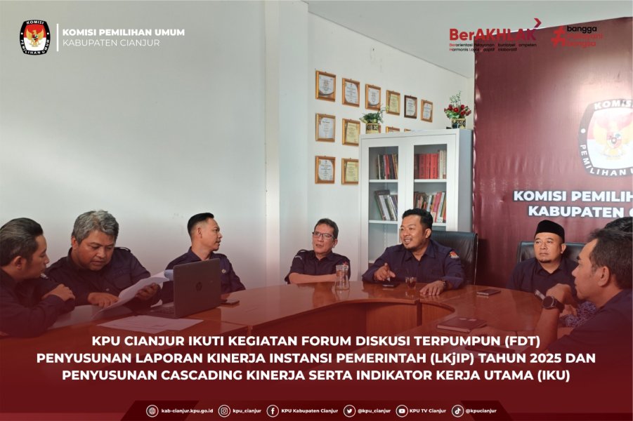 Cianjur - Komisi Pemilihan Umum (KPU) Kabupaten Cianjur mengikuti kegiatan Forum Diskusi Terpumpun (FDT) Penyusunan Laporan Kinerja Instansi Pemerintah (LKjIP) Tahun 2025 serta Penyusunan Cascading Kinerja dan Indikator Kinerja Utama (IKU) yang dilaksanakan secara daring pada Selasa (27/1). Dari KPU Kabupaten Cianjur, kegiatan tersebut diikuti oleh Ketua KPU Kabupaten Cianjur Muchamad Ridwan, Ketua Divisi Sosialisasi, Pendidikan Pemilih, Partisipasi Masyarakat, dan SDM Fikri Audah NSY, Ketua Divisi Teknis Penyelenggaraan Pemilu Abdulatif, Ketua Divisi Hukum dan Pengawasan Misbahudin, Sekretaris KPU Kabupaten Cianjur Muhammad Thomas Iqbal, serta para Kepala subbagian di lingkungan Sekretariat KPU Kabupaten Cianjur. Kegiatan ini bertujuan untuk meningkatkan pemahaman dan keselarasan dalam penyusunan LKjIP sebagai instrumen evaluasi kinerja instansi pemerintah, sekaligus memastikan keterkaitan antara sasaran strategis, cascading kinerja, dan Indikator Kinerja Utama (IKU) pada setiap unit kerja. Melalui forum diskusi yang berlangsung interaktif, peserta membahas penguatan perencanaan dan pelaporan kinerja agar pelaksanaan tugas dan fungsi KPU dapat berjalan lebih efektif, terukur, dan akuntabel sesuai dengan prinsip tata kelola pemerintahan yang baik. Melalui keikutsertaan dalam FDT ini, KPU Kabupaten Cianjur menegaskan komitmennya untuk terus meningkatkan kualitas kinerja kelembagaan yang berorientasi pada hasil, sejalan dengan nilai-nilai BerAKHLAK dan semangat bangga melayani bangsa, dalam mendukung penyelenggaraan pemilu dan pemilihan yang berintegritas. #KPUMelayani ....