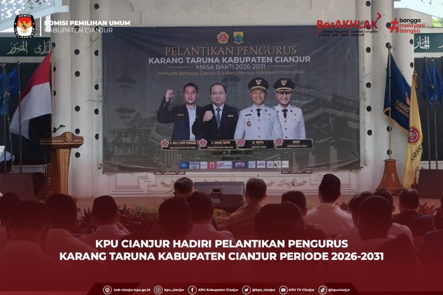 Cianjur - Komisi Pemilihan Umum (KPU) Kabupaten Cianjur menghadiri kegiatan Pelantikan Pengurus Karang Taruna Kabupaten Cianjur Masa Bakti 2026–2031 yang diselenggarakan pada Sabtu (31/1), bertempat di Pendopo Kabupaten Cianjur. Dari KPU Kabupaten Cianjur, kegiatan tersebut dihadiri oleh Ketua KPU Kabupaten Cianjur, Muchamad Ridwan. Kehadiran KPU Kabupaten Cianjur menunjukkan komitmen kelembagaan dalam mendukung organisasi kepemudaan sebagai mitra strategis dalam pembangunan daerah dan penguatan demokrasi. Kegiatan pelantikan tersebut dihadiri oleh unsur pemerintah daerah, Forkopimda, organisasi kepemudaan, tokoh masyarakat, serta para tamu undangan lainnya. Pelantikan ini mengusung tema “Pemuda Berdaya, Cianjur Era Baru Menuju Indonesia Emas 2045” dan menjadi momentum penting dalam memperkuat peran pemuda sebagai agen perubahan. Rangkaian acara diawali dengan pembukaan, pembacaan Surat Keputusan, prosesi pelantikan pengurus Karang Taruna Kabupaten Cianjur Periode 2026–2031, serta penandatanganan berita acara. Acara kemudian dilanjutkan dengan penyampaian sambutan dari para pejabat dan tokoh terkait. Kehadiran KPU Kabupaten Cianjur dalam kegiatan ini merupakan wujud sinergi dan komitmen kelembagaan untuk mendukung peran pemuda dalam membangun demokrasi yang inklusif dan berkelanjutan di Kabupaten Cianjur. #KPUMelayani ....