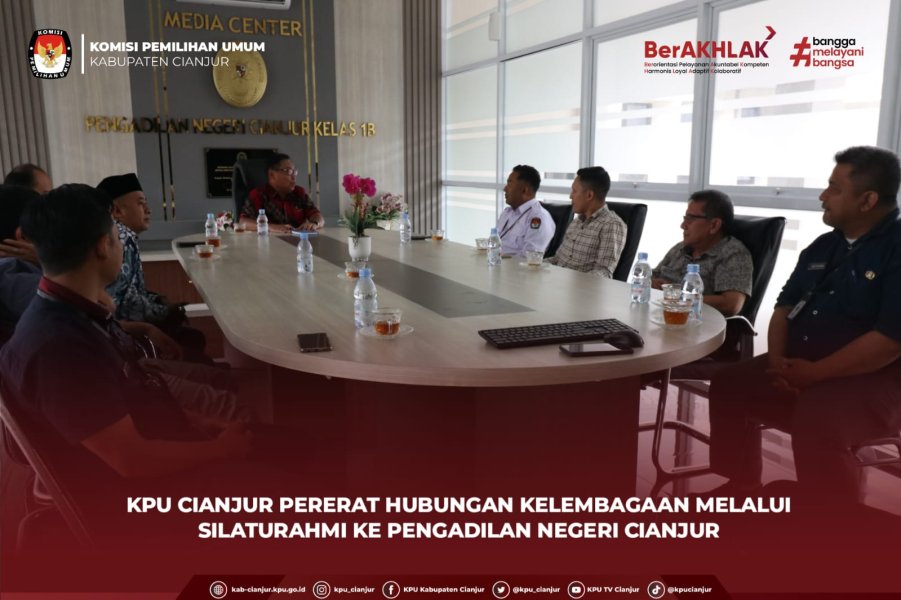 Cianjur - Komisi Pemilihan Umum (KPU) Kabupaten Cianjur melaksanakan kunjungan silaturahmi dan audiensi ke Kantor Pengadilan Negeri (PN) Cianjur Kelas 1B pada Kamis (12/2). Kunjungan ini merupakan bagian dari langkah strategis KPU Kabupaten Cianjur untuk membangun koordinasi yang lebih solid serta mempererat sinergi san menjalin koordinasi dengan jajaran forum komunikasi pimpinan daerah (Forkopimda). Pertemuan yang berlangsung hangat di ruang Media Center Pengadilan Negeri (PN) Cianjur tersebut disambut langsung oleh Ketua Pengadilan Negeri (PN) Cianjur Rudita Setya Hermawan, S.H., M.H.. Rombongan KPU Cianjur dipimpin oleh Ketua KPU, Muchamad Ridwan, didampingi Ketua Divisi Sosialisasi, Pendidikan Pemilih, Partisipasi Masyarakat, dan SDM Fikri Audah NSY; Ketua Divisi Hukum dan Pengawasan Misbahudin;Ketua Divisi Teknis Penyelenggaraan Pemilu Abdulatif; serta Sekretaris KPU Kabupaten Cianjur, Muhammad Thomas Iqbal, Kepala Subbagian Sosdiklihparmas dan SDM, Ipan Yuspian Firmansyah, serta Kepala Subbagian Perencanaan, Data Dan Informasi, Raden Andi Suhandi. Pertemuan ini menegaskan pentingnya sinergi kelembagaan antara penyelenggara Pemilu dan institusi peradilan agar komunikasi berjalan selaras, khususnya dalam menghadapi dinamika hukum pada setiap tahapan. Selain itu, dibahas pula koordinasi administrasi terkait dukungan data dan proses verifikasi yang melibatkan otoritas pengadilan guna memastikan validitas persyaratan calon dalam Pemilu maupun Pilkada. Ketua KPU Kabupaten Cianjur menyampaikan bahwa kunjungan tersebut merupakan wujud transparansi dan langkah proaktif KPU dalam menggandeng seluruh pihak agar setiap proses tetap berada dalam koridor hukum yang berlaku. Melalui silaturahmi ini, diharapkan terbangun harmoni kelembagaan yang semakin kuat demi mewujudkan Pemilu yang berintegritas dan bermartabat di Kabupaten Cianjur. #KPUMelayani ....