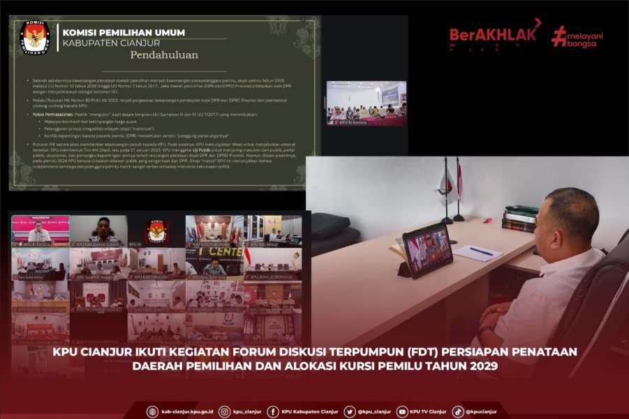 #TemanPemilih, KPU Kabupaten Cianjur mengikuti Forum Diskusi Terpumpun (FDT) Persiapan Penataan Daerah Pemilihan (Dapil) dan Alokasi Kursi Pemilu Tahun 2029 yang diselenggarakan oleh Komisi Pemilihan Umum Republik Indonesia pada Senin (9/3) secara daring melalui Zoom Meeting. Dari KPU Kabupaten Cianjur, kegiatan ini diikuti oleh Ketua Divisi Teknis Penyelenggaraan Pemilu, Abdulatif. Turut mendampingi Kepala Subbagian Teknis Penyelenggaraan Pemilu dan Hukum, Sanatha Perguna, bersama jajaran staf Sekretariat KPU Kabupaten Cianjur. Kegiatan ini bertujuan untuk menghimpun berbagai masukan, kajian, serta rekomendasi strategis terkait kebijakan penataan dapil dan alokasi kursi pada Pemilu 2029. Forum ini juga menjadi ruang berbagi pengalaman bagi penyelenggara pemilu di tingkat provinsi maupun kabupaten/kota sebagai bahan evaluasi dalam penyempurnaan kebijakan kepemiluan ke depan. Ketua Komisi Pemilihan Umum Republik Indonesia, Mochammad Afifuddin, menyampaikan bahwa masa pasca pemilu merupakan momentum penting untuk melakukan refleksi dan pembelajaran dari pengalaman penyelenggaraan pemilu sebelumnya. “Hasil evaluasi tersebut akan menjadi dasar dalam penyusunan rekomendasi perbaikan serta penyederhanaan tata kelola pemilu agar penyelenggaraan pemilu di masa mendatang dapat berjalan lebih efektif, efisien, dan berkualitas,” ujarnya. Kegiatan ini juga menghadirkan narasumber Wakil Ketua Komisi III DPR RI, Dede Yusuf, yang memberikan pandangan terkait aspek kebijakan dan kerangka regulasi dalam penataan daerah pemilihan serta alokasi kursi legislatif. Melalui forum diskusi ini diharapkan lahir berbagai gagasan konstruktif yang dapat menjadi bahan pertimbangan dalam penyusunan kebijakan penataan dapil dan alokasi kursi pada Pemilu 2029. KPU Kabupaten Cianjur berkomitmen untuk terus berpartisipasi aktif dalam setiap proses evaluasi dan penguatan sistem kepemiluan demi mewujudkan pemilu yang semakin demokratis, transparan, dan berintegritas. #KPUMelayani ....
