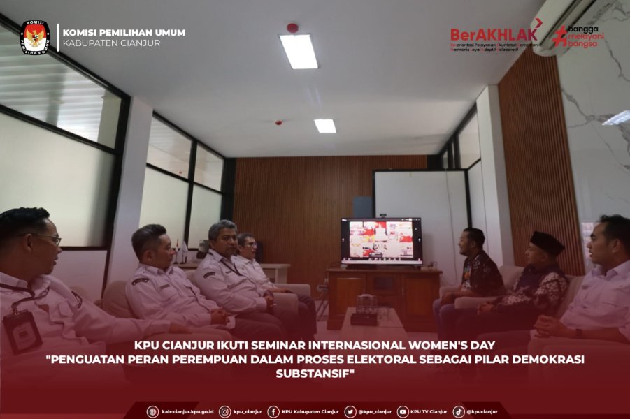 Cianjur - KPU Kabupaten Cianjur mengikuti Seminar dalam rangka peringatan International Women’s Day 2026 yang diselenggarakan oleh KPU RI dengan tema “Penguatan Peran Perempuan dalam Proses Elektoral sebagai Pilar Demokrasi Substantif” pada Kamis (12/3). Kegiatan ini diikuti secara daring melalui Zoom Meeting oleh jajaran Komisioner, Sekretaris, serta pejabat struktural di lingkungan KPU Kabupaten Cianjur. Seminar ini menjadi ruang refleksi sekaligus penguatan komitmen dalam mendorong partisipasi perempuan pada seluruh tahapan proses elektoral. Diskusi yang berlangsung menghadirkan berbagai perspektif mengenai pentingnya peran perempuan dalam memperkuat kualitas demokrasi, baik sebagai pemilih, penyelenggara, maupun sebagai bagian dari kepemimpinan politik di Indonesia. Dalam pemaparannya, narasumber menegaskan bahwa keterlibatan perempuan bukan sekadar pemenuhan angka representasi, tetapi merupakan elemen penting dalam menghadirkan demokrasi yang lebih inklusif, adil, dan representatif. Perspektif perempuan dinilai mampu memperkaya proses pengambilan kebijakan publik serta memperkuat kepercayaan masyarakat terhadap sistem demokrasi. Melalui kegiatan ini, diharapkan semakin tumbuh kesadaran kolektif untuk membuka ruang partisipasi yang lebih luas bagi perempuan dalam proses elektoral. Penguatan kapasitas, akses, serta dukungan terhadap kepemimpinan perempuan menjadi langkah strategis dalam mewujudkan demokrasi yang lebih substantif di masa mendatang. Mari terus dukung peran perempuan dalam demokrasi dan bersama membangun proses pemilu yang inklusif, berintegritas, dan berpihak pada kepentingan masyarakat luas. #KPUMelayani ....