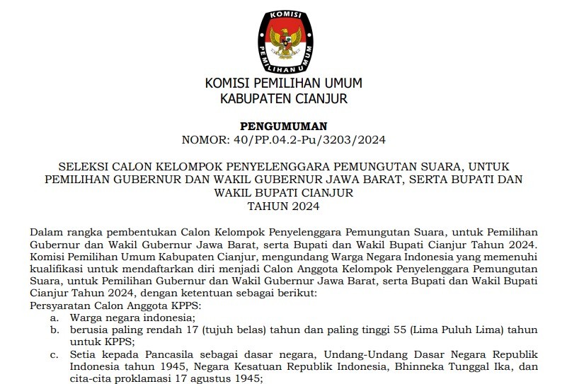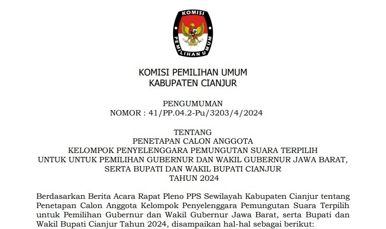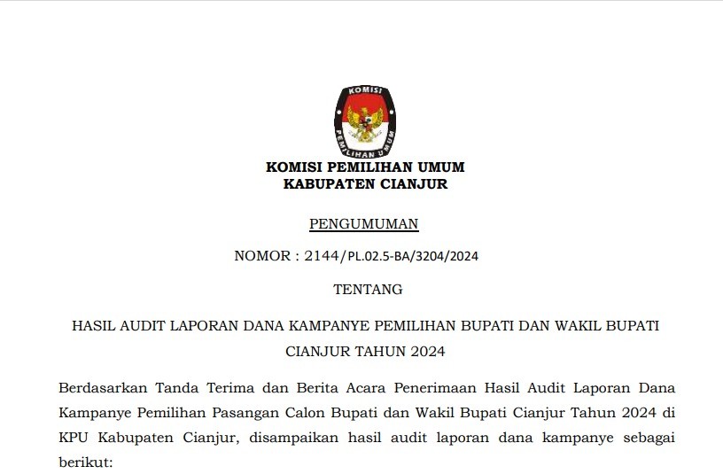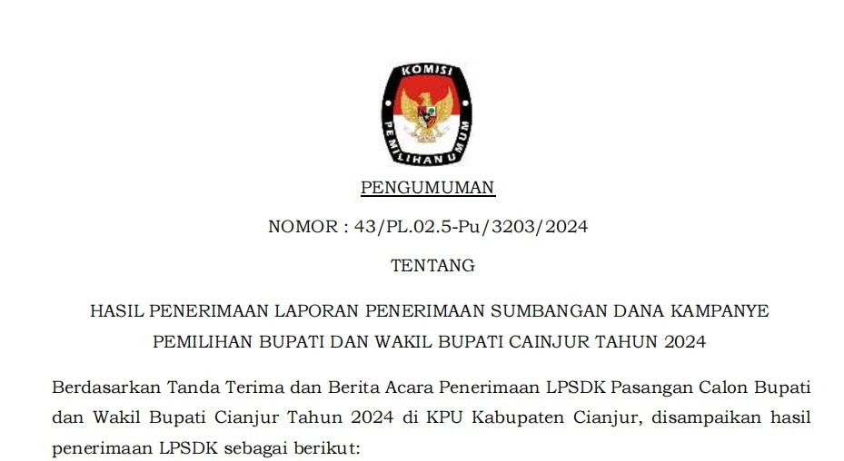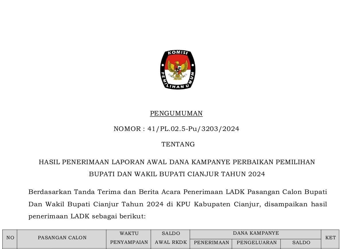 Berdasarkan program dan jadwal kegiatan tahapan dana kampanye pemilihan Gubernur dan Wakil Gubernur, Bupati dan Wakil Bupati, dan/ atau Walikota dan Wakil Walikota, bersama ini KPU Kabupaten Cianjur menyampaikan Pengumuman Laporan Awal Dana Kampanye (LADK) Pasangan Calon Peserta Pemilihan Bupati dan Wakil Bupati Cianjur Tahun 2024.
