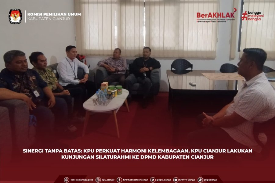 Cianjur - Komisi Pemilihan Umum (KPU) Kabupaten Cianjur melaksanakan kunjungan silaturahmi dan audiensi ke Dinas Pemberdayaan Masyarakat dan Desa (DPMD) Kabupaten Cianjur sebagai bagian dari upaya memperkuat sinergi dan harmonisasi antar lembaga pada Jumat (20/2), disambut langsung oleh Sekretaris DPMD Kabupaten Cianjur, Dendy Kristanto, S.STP.