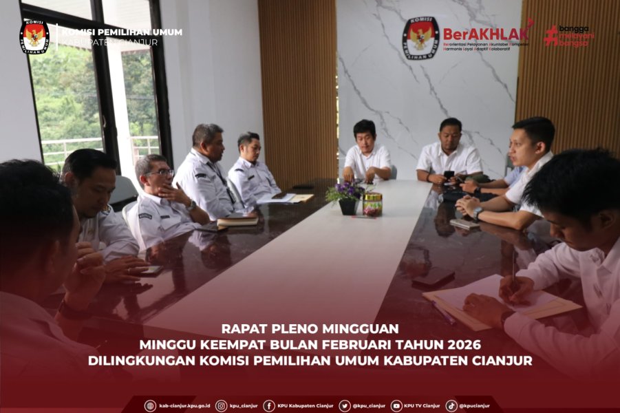 Cianjur - Komisi Pemilihan Umum (KPU) Kabupaten Cianjur melaksanakan Rapat Pleno Mingguan pada Minggu Keempat bulan Februari 2026. Kegiatan ini berlangsung di ruang rapat KPU Kabupaten Cianjur pada Senin (23/2).