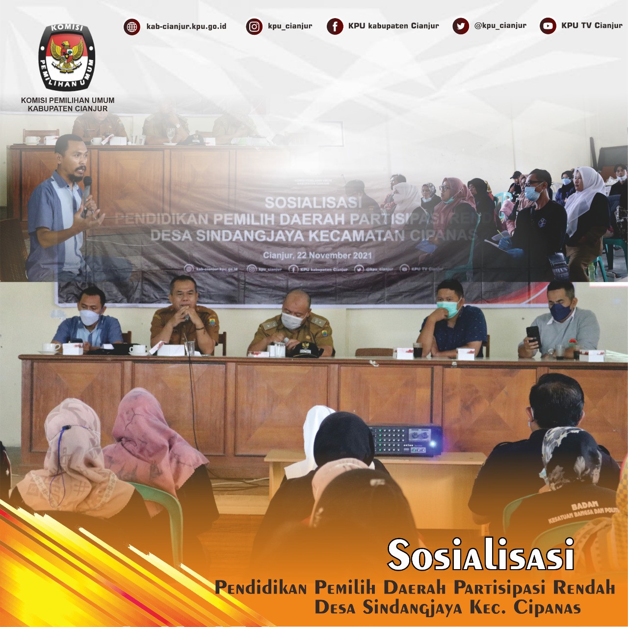 Cipanas - Dalam rangka Pendidikan Pemilih kepada Masyarakat khususnya di daerah partisipasi rendah, Komisi Pemilihan Umum Kabupaten Cianjur kembali melaksanakan kegiatan Sosialisasi ada evaluasi partisipasi masyarakat pada Pemilihan Serentak Tahun 2020, kegiatan tersebut digelar di aula Desa Sindangjaya, Kecamatan Cipanas, Senin (22/11). Dalam kesempatan ini KPU Cianjur dalam melaksanakan kegiatan Berkolaborasi dengan Badan Kesbangpol Kabupaten Cianjur, pihak kecamatan dan pihak Desa terkait sebagai tuan rumah.