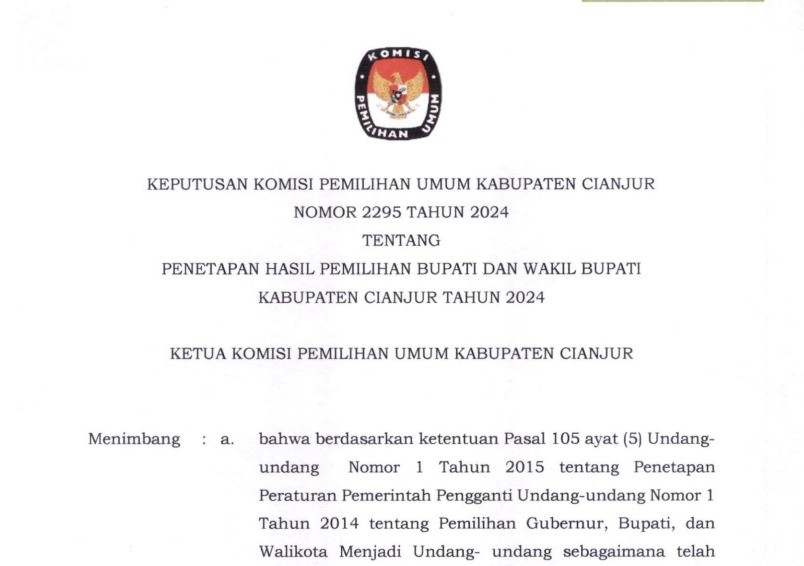 KLIK DISINI untuk unduh Salinan Keputusan Komisi Pemilihan Umum Kabupaten Cianjur Nomor 2295 Tahun 2024 Tentang Penetapan Hasil Pemilihan Bupati dan Wakil Bupati Cianjur Tahun 2024