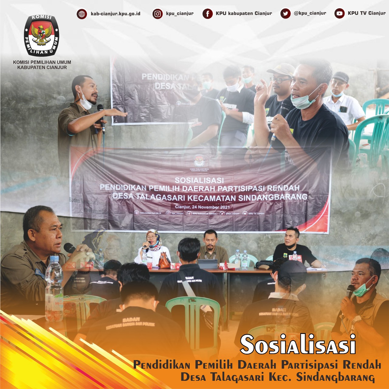 Sindangbarang - Sebagai salah satu upaya meningkatkan partisipasi masyarakat, KPU Cianjur melaksanakan kegiatan Sosialisasi Pendidikan Pemilih Daerah Partisipasi Rendah di Desa Talagasari Kecamatan Sindangbarang, sosialisasi ini merupakan kegiatan pertama yang dilaksanakan di Wilayah Cianjur Selatan dari serangkaian sosialisasi pendidikan pemilih yang telah di gelar KPU Cianjur pasca pelaksanaan Pilkada Serentak Tahun 2020. Adapun pada pelaksanaannya KPU Cianjur bekerjasama dengan Bakesbangpol Cianjur, Pemerintahan Kecamatan Sindangbarang dan Pemerintahan Desa Talagasari.