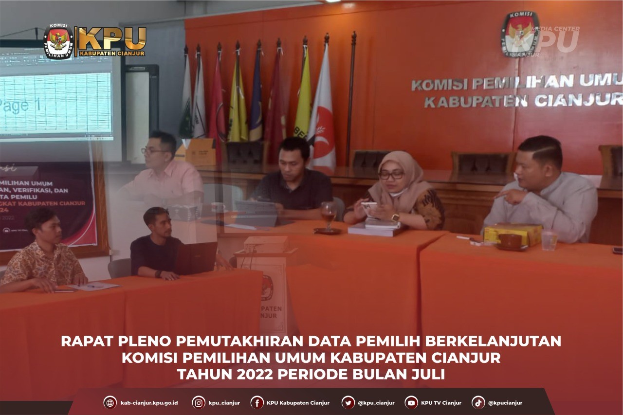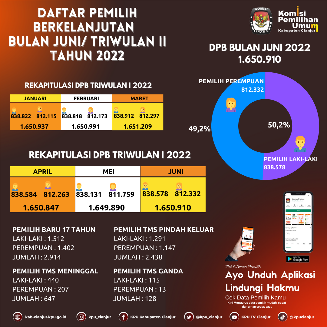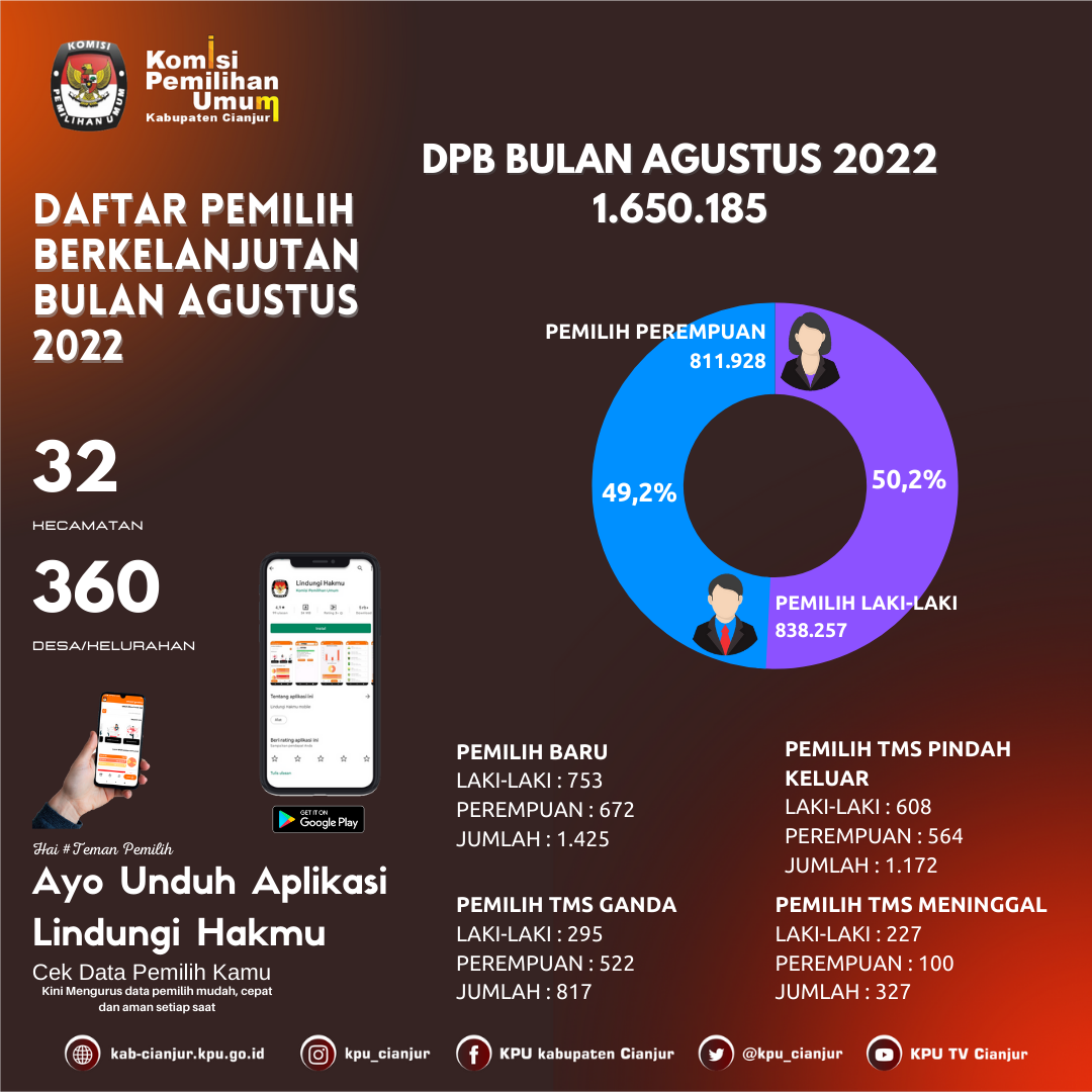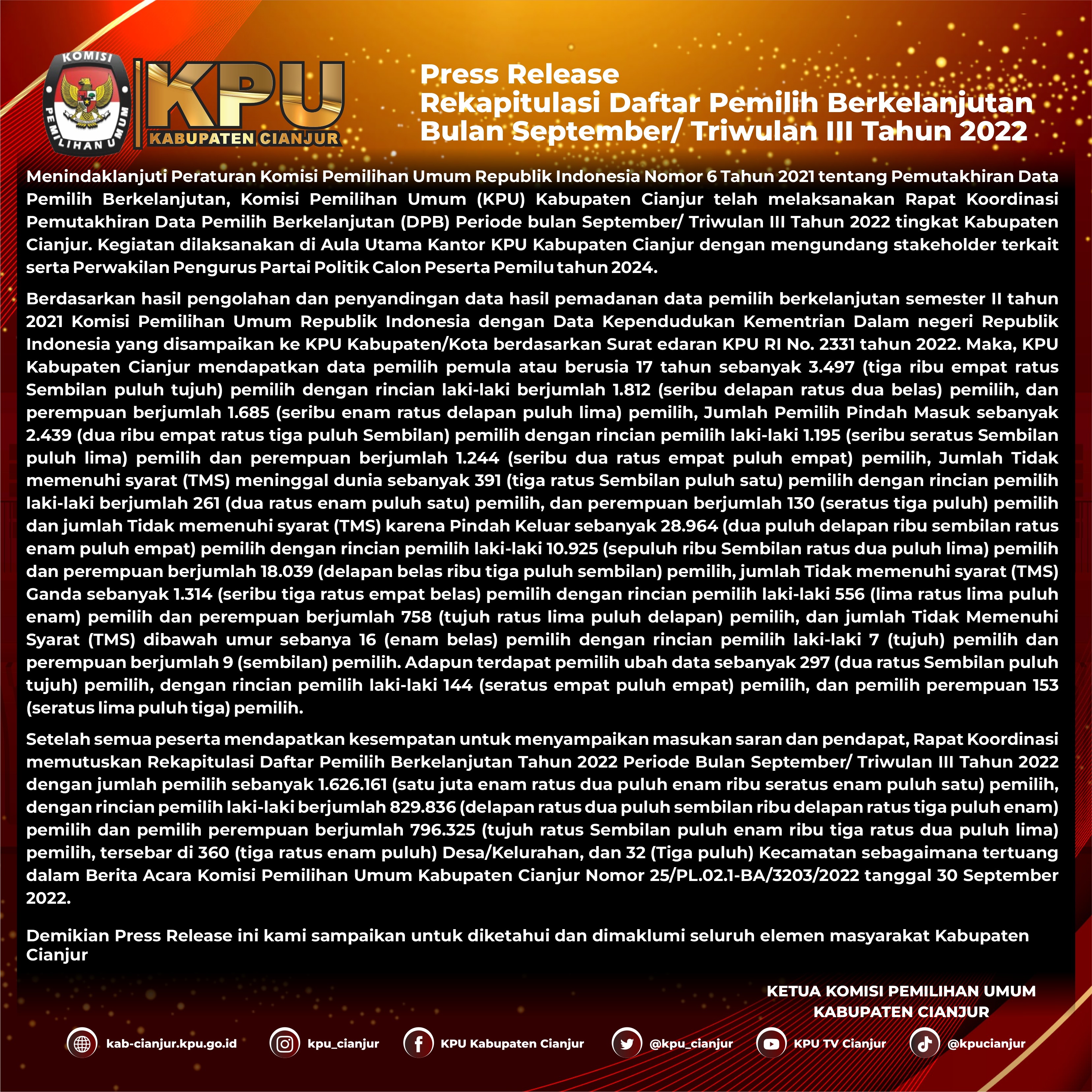 PRESS RELEASE TENTANG REKAPITULASI DAN PENGUMUMAN DAFTAR PEMILIH BERKELANJUTAN PERIODE BULAN SEPTEMBER/ TRIWULAN III TAHUN 2022 Jumat, 30 September 2022 - Menindaklanjuti Peraturan Komisi Pemilihan Umum Republik Indonesia Nomor 6 Tahun 2021 tentang Pemutakhiran Data Pemilih Berkelanjutan, Komisi Pemilihan Umum (KPU) Kabupaten Cianjur telah melaksanakan Rapat Koordinasi Pemutakhiran Data Pemilih Berkelanjutan (DPB) Periode bulan September/ Triwulan III Tahun 2022 tingkat Kabupaten Cianjur. Kegiatan dilaksanakan di Aula Utama Kantor KPU Kabupaten Cianjur dengan mengundang stakeholder terkait serta Perwakilan Pengurus Partai Politik Calon Peserta Pemilu tahun 2024. Berdasarkan hasil pengolahan dan penyandingan data hasil pemadanan data pemilih berkelanjutan semester II tahun 2021 Komisi Pemilihan Umum Republik Indonesia dengan Data Kependudukan Kementrian Dalam negeri Republik Indonesia yang disampaikan ke KPU Kabupaten/Kota berdasarkan Surat edaran KPU RI No. 2331 tahun 2022. Maka, KPU Kabupaten Cianjur mendapatkan data pemilih pemula atau berusia 17 tahun sebanyak 3.497 (tiga ribu empat ratus Sembilan puluh tujuh) pemilih dengan rincian laki-laki berjumlah 1.812 (seribu delapan ratus dua belas) pemilih, dan perempuan berjumlah 1.685 (seribu enam ratus delapan puluh lima) pemilih, Jumlah Pemilih Pindah Masuk sebanyak 2.439 (dua ribu empat ratus tiga puluh Sembilan) pemilih dengan rincian pemilih laki-laki 1.195 (seribu seratus Sembilan puluh lima) pemilih dan perempuan berjumlah 1.244 (seribu dua ratus empat puluh empat) pemilih, Jumlah Tidak memenuhi syarat (TMS) meninggal dunia sebanyak 391 (tiga ratus Sembilan puluh satu) pemilih dengan rincian pemilih laki-laki berjumlah 261 (dua ratus enam puluh satu) pemilih, dan perempuan berjumlah 130 (seratus tiga puluh) pemilih dan jumlah Tidak memenuhi syarat (TMS) karena Pindah Keluar sebanyak 28.964 (dua puluh delapan ribu sembilan ratus enam puluh empat) pemilih dengan rincian pemilih laki-laki 10.925 (sepuluh ribu Sembilan ratus dua puluh lima) pemilih dan perempuan berjumlah 18.039 (delapan belas ribu tiga puluh sembilan) pemilih, jumlah Tidak memenuhi syarat (TMS) Ganda sebanyak 1.314 (seribu tiga ratus empat belas) pemilih dengan rincian pemilih laki-laki 556 (lima ratus lima puluh enam) pemilih dan perempuan berjumlah 758 (tujuh ratus lima puluh delapan) pemilih, dan jumlah Tidak Memenuhi Syarat (TMS) dibawah umur sebanya 16 (enam belas) pemilih dengan rincian pemilih laki-laki 7 (tujuh) pemilih dan perempuan berjumlah 9 (sembilan) pemilih. Adapun terdapat pemilih ubah data sebanyak 297 (dua ratus Sembilan puluh tujuh) pemilih, dengan rincian pemilih laki-laki 144 (seratus empat puluh empat) pemilih, dan pemilih perempuan 153 (seratus lima puluh tiga) pemilih. Setelah semua peserta mendapatkan kesempatan untuk menyampaikan masukan saran dan pendapat, Rapat Koordinasi memutuskan Rekapitulasi Daftar Pemilih Berkelanjutan Tahun 2022 Periode Bulan September/ Triwulan III Tahun 2022 dengan jumlah pemilih sebanyak 1.626.161 (satu juta enam ratus dua puluh enam ribu seratus enam puluh satu) pemilih, dengan rincian pemilih laki-laki berjumlah 829.836 (delapan ratus dua puluh sembilan ribu delapan ratus tiga puluh enam) pemilih dan pemilih perempuan berjumlah 796.325 (tujuh ratus Sembilan puluh enam ribu tiga ratus dua puluh lima) pemilih, tersebar di 360 (tiga ratus enam puluh) Desa/Kelurahan, dan 32 (Tiga puluh) Kecamatan sebagaimana tertuang dalam Berita Acara Komisi Pemilihan Umum Kabupaten Cianjur Nomor 25/PL.02.1-BA/3203/2022 tanggal 30 September 2022. Demikian Press Release ini kami sampaikan untuk diketahui dan dimaklumi seluruh elemen masyarakat Kabupaten Cianjur KOMISI PEMILIHAN UMUM KABUPATEN CIANJUR, Ttd SELLY NURDINAH