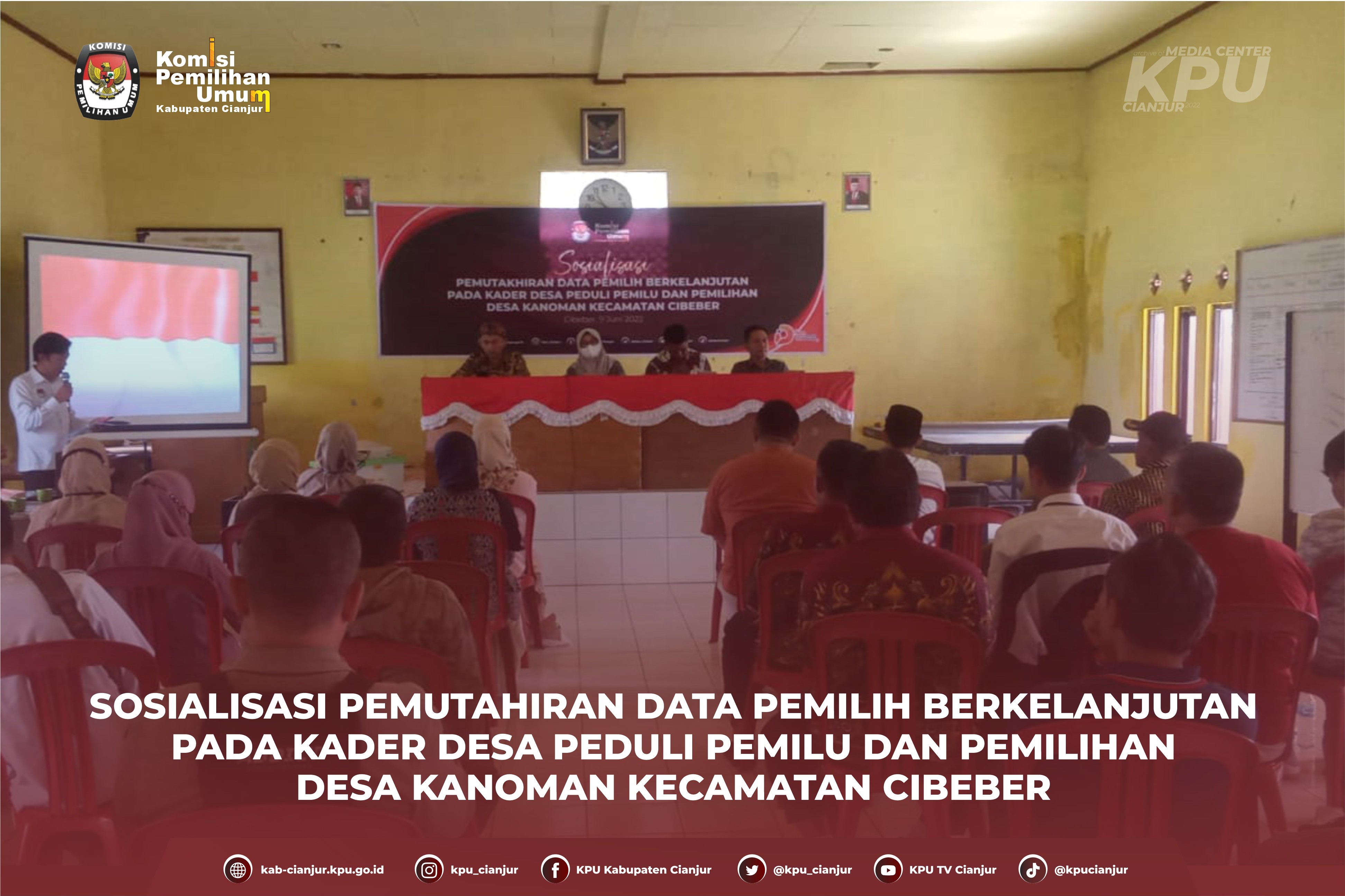 Cibeber - Bertempat di Aula Desa Kanoman Kecamatan Cibeber, KPU Kabupaten Cianjur melaksanakan kegiatan Sosialisasi Pemutakhiran Data Pemilih Berkelanjutan kepada 25 orang Kader Desa Peduli Pemilu dan Pemilihan Desa Kanoman yang telah dibentuk pada tanggal 11 Desember 2021 yang selanjutnya difungsikan sebagai agen² sosialisasi untuk menginformasikan terkait Pemilu Serentak Tahun 2024 khususnya terkait pemutakhiran data pemilih. Memberikan sambutan dalam kegiatan, Sekretaris Kecamatan Cibeber, M. Dadan Asikin, dan Ketua KPU Kabupaten Cianjur, Selly Nurdinah sekaligus membuka acara kegiatan, serta penyampaian materi diberikan oleh Kepala Bidang Penataan Desa dan Kerjasama Desa DPMD Kabupaten Cianjur, Dendi Kristianto, Wakil Ketua Divisi Perdatin KPU Kabupaten Cianjur, Rustiman, dan Kepala Sub bagian Perencanaan Data dan Informasi, Ipan Y. Firmansyah. Rustiman menyampaikan bahwa berdasarkan PKPU 6 Tahun 2021 tentang Pemutakhiran Data Pemilih Berkelanjutan, Kabupaten/Kota harus melakukan Pemutakhiran Data Pemilih berdasarkan DPT Pemilu terakhir secara Berkelanjutan, Daftar Pemilih di perbaharui secara terus menerus dengan mekanisme kerja yang memungkinkan pemutakhiran data pemilih secara berkala, secara terukur kekurangan dan masalah teknis administrasi daftar pemilih yang teridentifikasi dapat di perbaiki, menurutnya hal ini dapat memudahkan kerja secara teknis secara berkelanjutan, selain itu pemutakhiran daftar pemilih berkelanjutan meminimalisir kecurigaan atau potensi manipulasi daftar pemilih, hal ini dikarenakan pendekatan Pemutahiran Data Pemilih Berkelanjutan memungkinkan pemilih untuk mengakses data pemilih setiap saat. ~Adhari F.