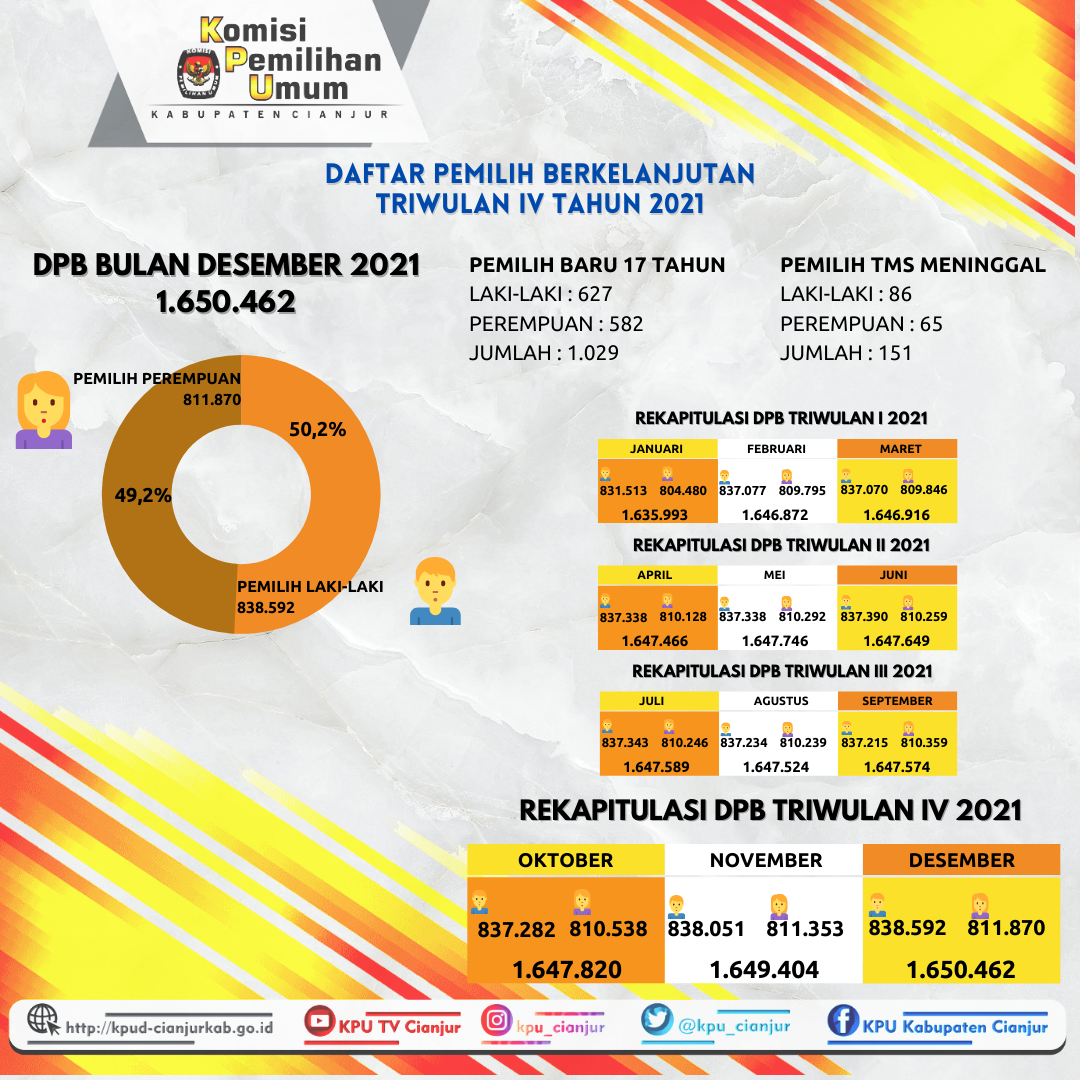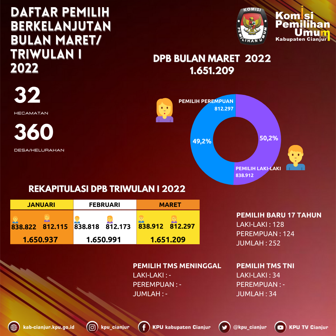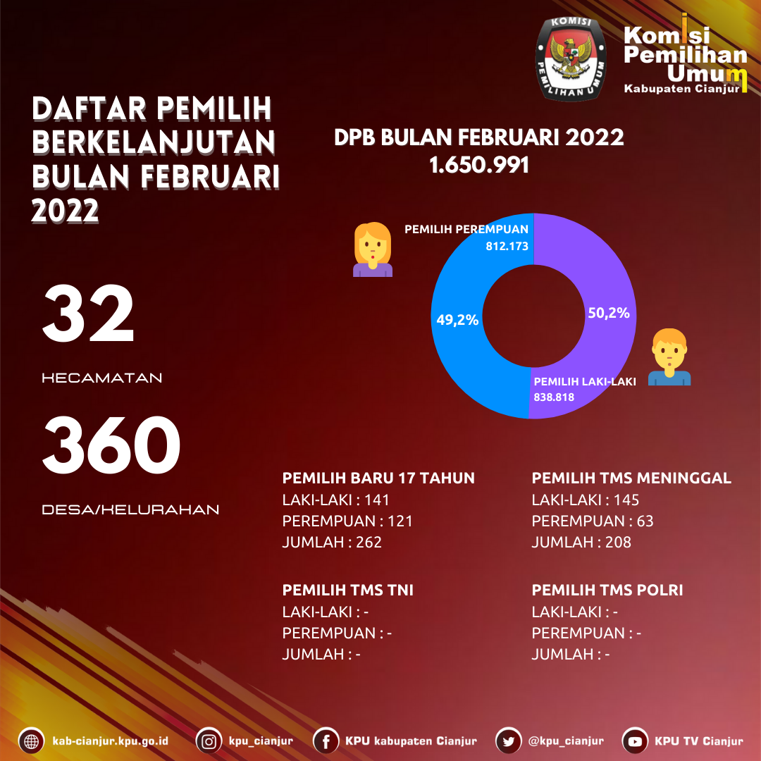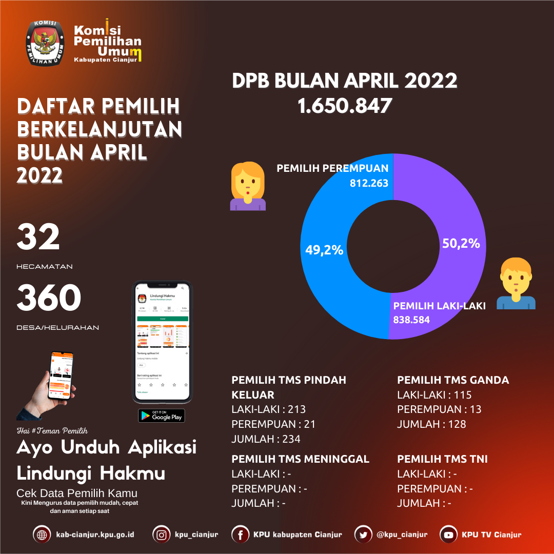 PRESS RELEASE TENTANG REKAPITULASI DAN PENGUMUMAN DAFTAR PEMILIH BERKELANJUTAN PERIODE BULAN APRIL TAHUN 2022 Cianjur, kab-cianjur.kpu.go.id - Menindaklanjuti Peraturan Komisi Pemilihan Umum Republik Indonesia Nomor 6 Tahun 2021 tentang Pemutakhiran Data Pemilih Berkelanjutan. Pada hari ini Senin, tanggal 25 April 2022 Komisi Pemilihan Umum Kabupaten Cianjur melaksanakan Rapat Koordinasi Pemutakhiran Daftar Pemilih Berkelanjutan (DPB) Periode Bulan April Tahun 2022 tingkat Kabupaten Cianjur. Berdasarkan hasil koordinasi dengan Disdukcapil Kab. Cianjur melalui sinkronisasi antara data yang diperoleh dari hasil pengelolaan internal KPU dan data yang ada di Dukcapil, maka diperoleh update data dari tanggal 28 Maret 2022 sampai dengan tanggal 24 April 2022 dengan jumlah Tidak memenuhi syarat (TMS) Pindah Keluar sebanyak 234 (Dua ratus tiga puluh empat) pemilih dengan rincian pemilih laki-laki berjumlah 213 (Dua ratus tiga belas) pemilih, dan perempuan berjumlah 21 (Dua puluh satu) pemilih dan jumlah Tidak memenuhi syarat (TMS) Ganda sebanyak 128 (Seratus dua puluh delapan) pemilih dengan rincian pemilih laki-laki 115 (Seratus lima belas) pemilih dan perempuan berjumlah 13 (Tiga belas) pemilih, sehingga Rapat Koordinasi memutuskan Rekapitulasi Daftar Pemilih Berkelanjutan Tahun 2022 Periode Bulan April Tahun 2022 dengan jumlah pemilih sebanyak 1.650.847 (Satu juta enam ratus lima puluh ribu delapan ratus empat puluh tujuh) pemilih, dengan rincian pemilih laki-laki berjumlah 838.584 (Delapan ratus tiga puluh delapan ribu lima ratus delapan puluh empat) pemilih, dan pemilih perempuan berjumlah 812.263 (Delapan ratus dua belas ribu dua ratus enam puluh tiga) pemilih, tersebar di 360 (tiga ratus enam puluh) Desa/Kelurahan, dan 32 (Tiga puluh) Kecamatan sebagaimana tertuang dalam Berita Acara Komisi Pemilihan Umum Kabupaten Cianjur Nomor 9/PL.02.1-BA/3203/2022 tanggal 25 April 2022. Demikian Press Release ini kami sampaikan untuk diketahui dan dimaklumi seluruh elemen masyarakat Kabupaten Cianjur KOMISI PEMILIHAN UMUM KABUPATEN CIANJUR, Ttd SELLY NURDINAH