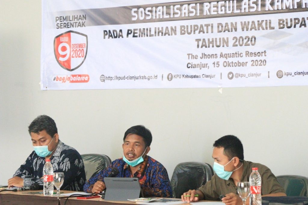 Komisi Pemilihan Umum (KPU) Kab. Cianjur melakukan sosialisasi regulasi kampanye pada Pemilihan Serentak lanjutan 2020. Sosialisasi dilakukan untuk menyampaikan regulasi agar kampanye yang dilakukan partai atau gabungan partai, tim sukses/pasangan calon dapat dilakukan sesuai dengan ketentuan.