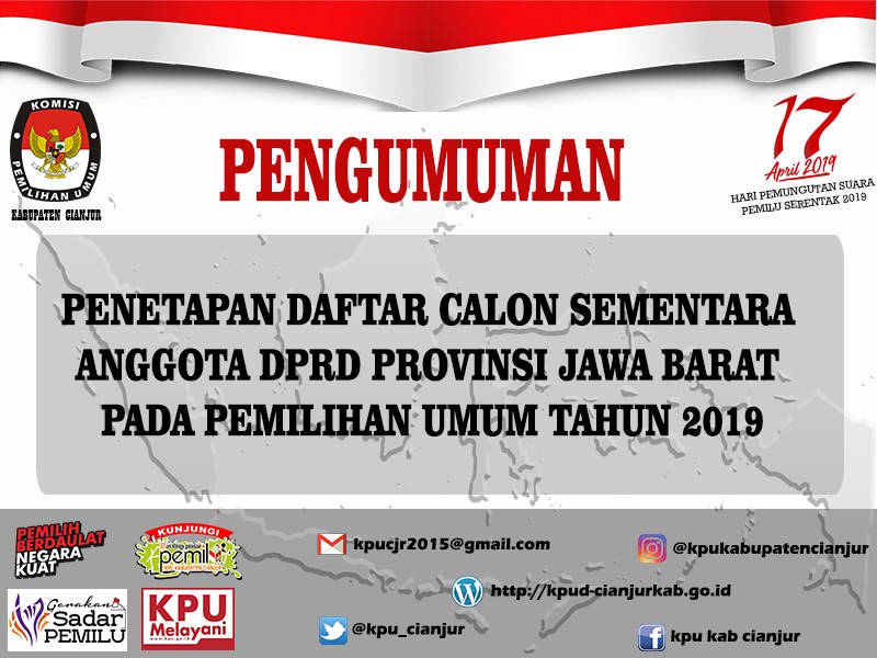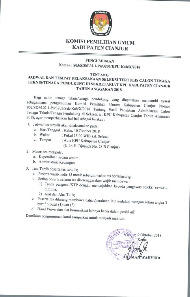 Pengumuman hasil seleksi Administrasi tanggal 6 Oktober 2018 di papan pengumuman KPU Kabupaten Cianjur dan laman KPU Kabupaten Cianjur http://www.kpud-cianjurkab.go.id.