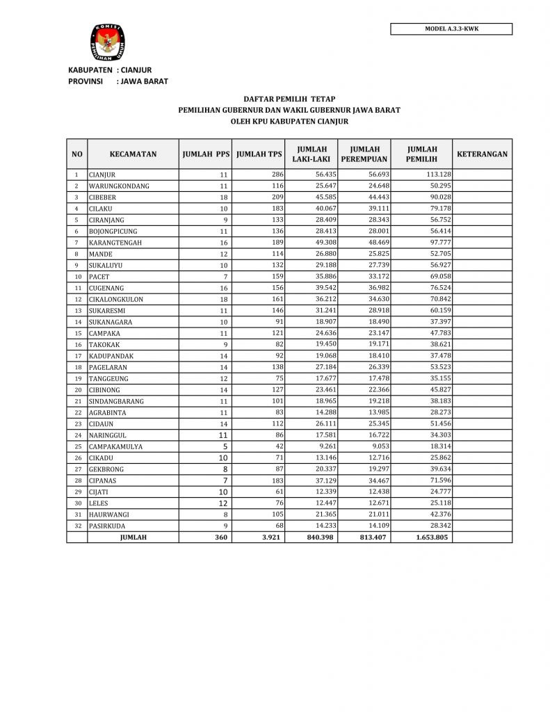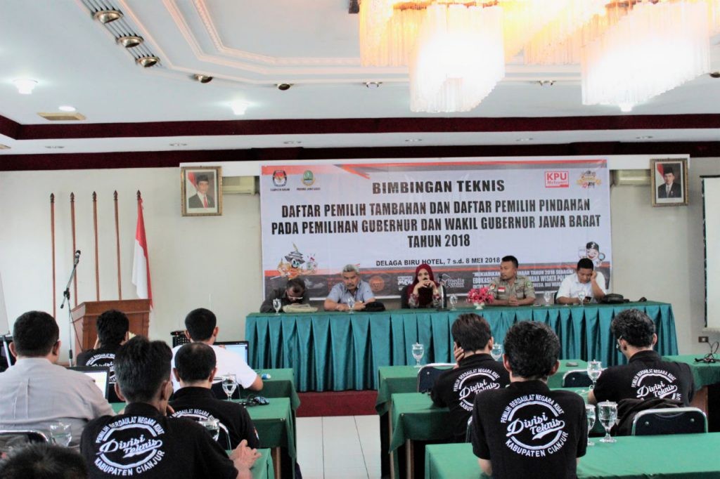 Pacet, kpud-cianjurkab.go.id.- Komisi Pemilihan Umum (KPU) Kabupaten Cianjur menggelar Bimbingan Teknis Daftar Pemilih Tambahan dan Daftar Pemilih Pindahan pada pemilihan Gubernur dan Wakil Gubernur Jawa Barat Tahun 2018, bertempat di Delaga Biru Hotel tanggal 07 sampai 08 Mei 2018. Bimbingan Teknis ini dihadiri oleh Ketua KPU Kabupaten Cianjur Anggy Shofia Wardany, Komisioner Divisi Program dan Data Kusnadi, Komisioner Divisi Keuangan, Umum dan Logistik Baban Marhaenda, Komisioner Divisi SDM dan Parmas Hilman Wahyudi, Sekretaris KPU Kabupaten Cianjur Endan Hamdani, Kasubag Hukum Jamaludin beserta para staff program dan data. Peserta dalam kegiatan ini yaitu 32 anggota PPK Divisi Program dan Data Se-Kabupaten Cianjur. Bimtek dibuka resmi oleh Ketua KPU Kabupaten Cianjur. Selanjutnya diserahkan kepada Komisioner Divisi Program dan Data untuk memberikan pengarahan. “Daftar Pemilih Pindahan (DPPh) yaitu para Pemilih yang sudah terdaftar dalam DPT, tapi menggunakan hak pilihnya di TPS berbeda,” ujar Kusnadi. “Bagi Pemilih yang terdaftar dalam DPT tapi menggunakan hak pilihnya di TPS lain, harus menggunakan Form A5 dengan batas waktu paling lambat tiga hari sebelum pemungutan suara,” tambahnya. Kusnadi juga menjelaskan mengenai Daftar Pemilih Tambahan (DPTb). DPTb ialah warga yang memenuhi syarat sebagai Pemilih namun tidak terdaftar dalam DPT, Pemilih dapat menggunakan hak pilihnya dengan syarat membawa KTP Elektronik atau Suket dan dapat memilih pada waktu satu jam sebelum TPS ditutup. “Jika ada Pemilih yang ingin ikut mencoblos tapi tidak terdaftar di DPT, Petugas harus melakukan verifikasi dengan memakai KTP Elektronik ataupun Surat Keterangan kemudian didata kedalam form A.Tb-KWK dan dipersilahkan untuk ikut memilih pada saat satu jam sebelum penutupan TPS atau setelah jam 12 siang,”ujar Kusnadi. Selain itu, Disdukcapil ikut memberikan materi dalam kegiatan Bimtek ini. Dalam materinya, Disdukcapil memberikan penerangan mengenai dukungan pihaknya menuju Pemilihan Gubernur dan Wakil Gubernur Jawa Barat Tahun 2018. Kegiatan ini berjalan secara lancar disertai tanya jawab antara peserta dengan pemateri. Peserta mengikuti jalannya kegiatan BimTek dengan melakukan simulasi perihal DPPh dan DPTb.