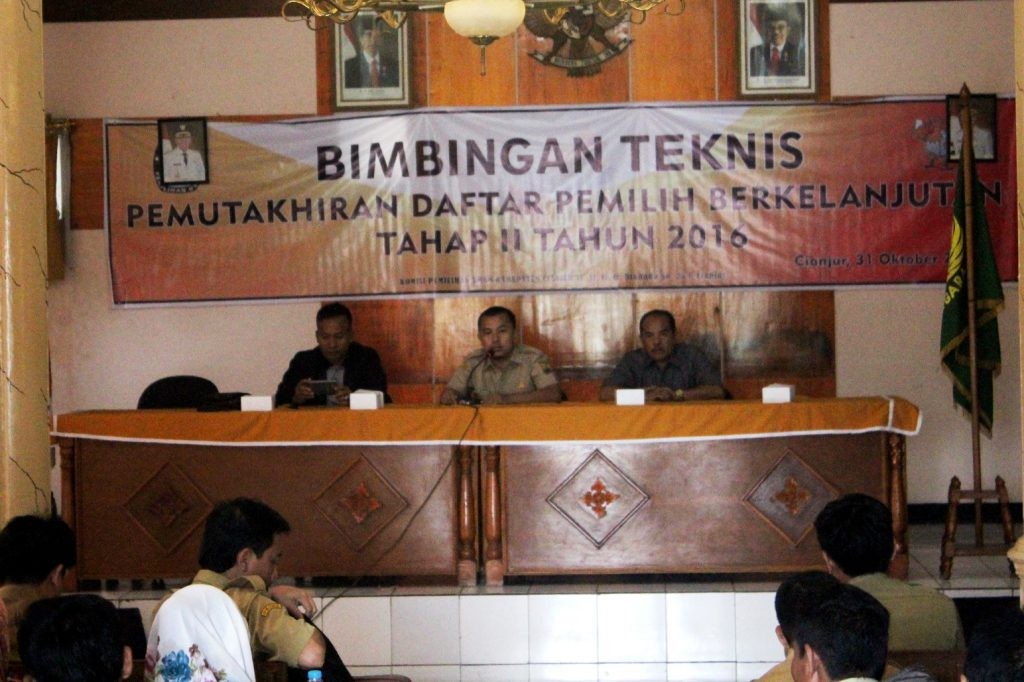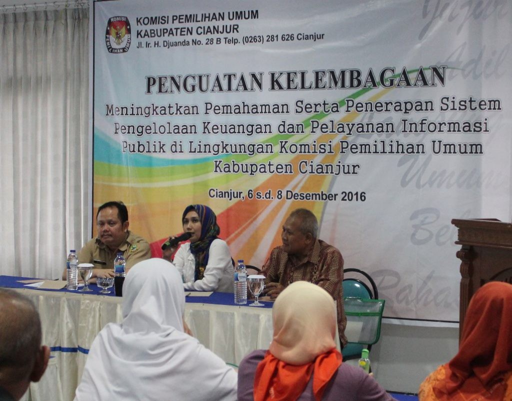 CIANJUR, kpud-cianjurkab.go.id – Komisi Pemilihan Umum Kabupaten Cianjur melaksanakan Penguatan Kelembagaan Meningkatkan Pemahaman Serta Penerapan Sistem Pengeloaan Keuangan dan Pelayanan Informasi Publik di Lingkungan Komisi Pemilihan Umum Kabupaten Cianjur yang dilaksanakan selama 3 (tiga) hari, 6 – 8 Desember 2016. Dihadiri oleh seluruh pegawai Sekretariat dan Komisioner KPU Kabupaten Cianjur. Agenda dalam kegiatan penguatan kelembagaan ini guna meningkatkan pemahaman dan penerapan pelaksanaan program kegiatan yang dilaksanakan oleh Komisi Pemilihan Umum Kabupaten Cianjur. Pada penguatan kelembagaan ini Komisi Pemilihan Umum Kabupaten Cianjur menekankan untuk peningkatan pemahaman pada Pengeloaan Keuangan dan Pelayanan Informasi Publik. Penguatan Kelembagaan Meningkatkan Pemahaman Serta Penerapan Sistem Pengeloaan Keuangan dan Pelayanan Informasi Publik di Lingkungan Komisi Pemilihan Umum Kabupaten Cianjur ini menghadirkan 5 (lima) narasumber dari beberapa instansi pemerintahan yang berpengalaman dalam bidang sesuai dengan tema kebiatan kelembagaan ini, yaitu : Ir. Edi Supari, M.Si, Kepala Bagian Program, Data, Organisasi dan SDM KPU Provinsi Jawa Barat. Muhammad Zen Al-Faqih, SH., SS., M.Si, Wakil Ketua Komisi Informasi Provinsi Jawa Barat. Rizki Tavianto Karipany, Kepala Bidang PPA I Kanwil DJPB Provinsi Jawa Barat. Haerul Anwar, Kepala Seksi PPA ID Kanwil DJPB Provinsi Jawa Barat. Pratama Nugraha Emmawan, SH., M.Si, Kepala Bagian Hubungan Masyarakat dan Keprotokolan Sekretariat Kabupaten Cianjur. Penguatan kelembagaan dapat diartikan sebagai peningkatan kapasitas kelembagaan/organisasi. Penguatan Kapasitas merupakan proses peningkatan kemampuan yang dimiliki oleh setiap individu, kelembagaan maupun sistem atu\au jejaring antar individu dan kelompok/organisasi, serta pihak lain sampai area global dalam melaksanakan pembangunan dalam arti luas serta berkelanjutan. Dari pengertian di atas, dapat dilihat bahwa kegiatan Penguatan Kelembagaan Meningkatkan Pemahaman Serta Penerapan Sistem Pengeloaan Keuangan dan Pelayanan Informasi Publik di Lingkungan Komisi Pemilihan Umum Kabupaten Cianjur ini merupakan strategi KPU Kabupaten Cianjur guna meningkatkan pemberdayaan seluruh anggota Sekretariat dan Komisioner KPU Kabupaten Cianjur untuk menjadi penyelenggara pemilu yang integritas dan aktif, yang artinya kekuatan atau daya yang dimiliki setiap individu terus menerus dikembangkan untuk menghasilkan sesuatu tujuan yang optimal.