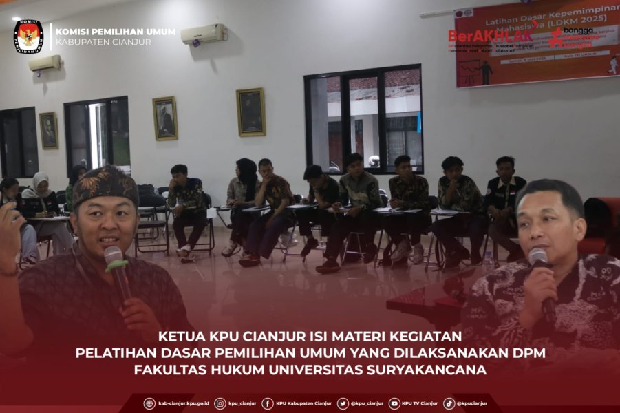 Cianjur - Ketua Komisi Pemilihan Umum (KPU) Kabupaten Cianjur, Muchamad Ridwan, hadir sebagai narasumber dalam kegiatan Pelatihan Dasar Pemilihan Umum yang diselenggarakan oleh Dewan Perwakilan Mahasiswa (DPM) Fakultas Hukum Universitas Suryakancana (Unsur), Jumat (9/5). Kegiatan berlangsung di Auditorium Fakultas Hukum dan diikuti oleh mahasiswa FH Unsur dari berbagai angkatan.