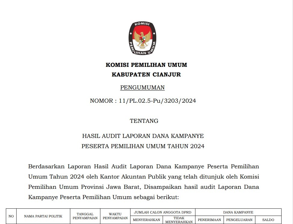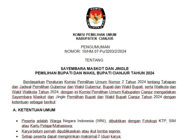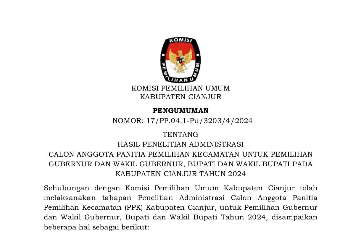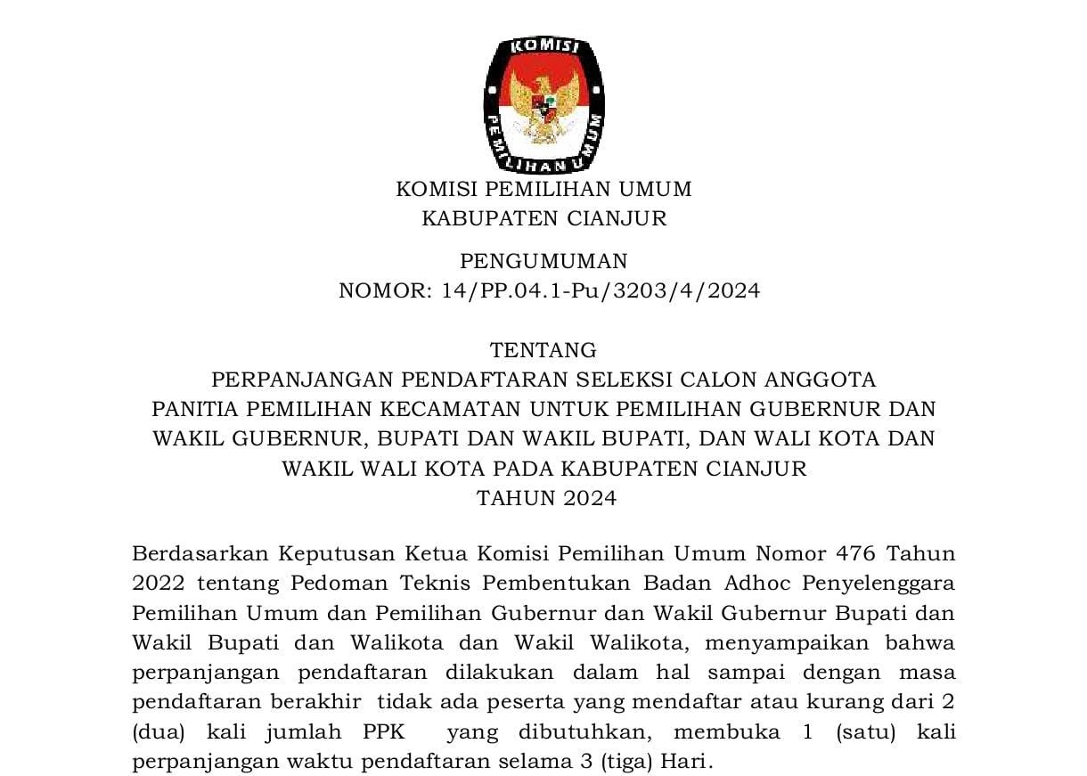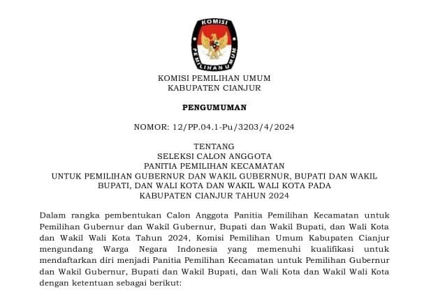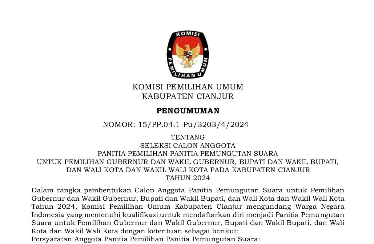 Komisi Pemilihan Umum Kabupaten Cianjur mengundang Warga Negara Indonesia yang memenuhi kualifikasi untuk mendaftarkan diri menjadi Panitia Pemungutan Suara untuk Pemilihan Gubernur dan Wakil Gubernur Provinsi Jawa Barat, Bupati dan Wakil Bupati Cianjur Tahun 2024